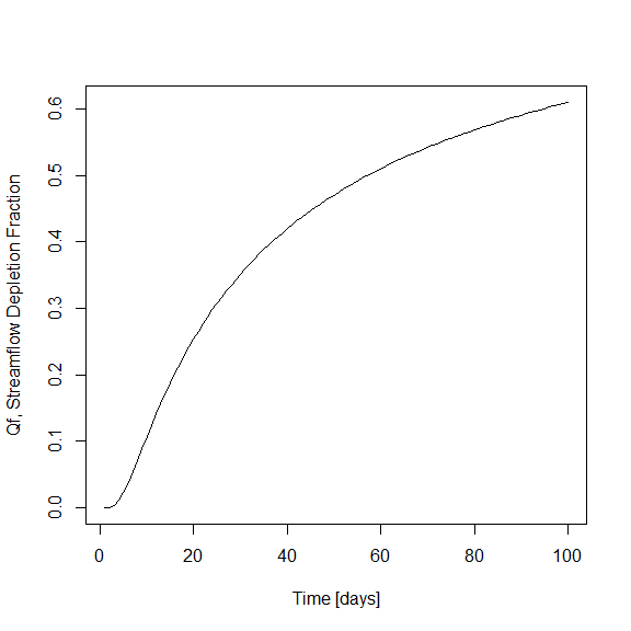 plot(seq(1,100), Qf, type="l", xlab="Time [days]", ylab="Qf, Streamflow Depletion Fraction")