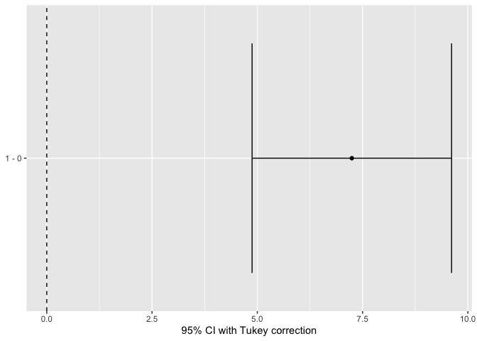 #> 1 1 0 7.245 1.248 5.807 30 3.642 10.848 .0003The output of this code will is one table showing the comparison of manual and automatic transmissions with regard to miles-per-gallon. The pooled standard error is the same as the square root of the MSE from the full model.