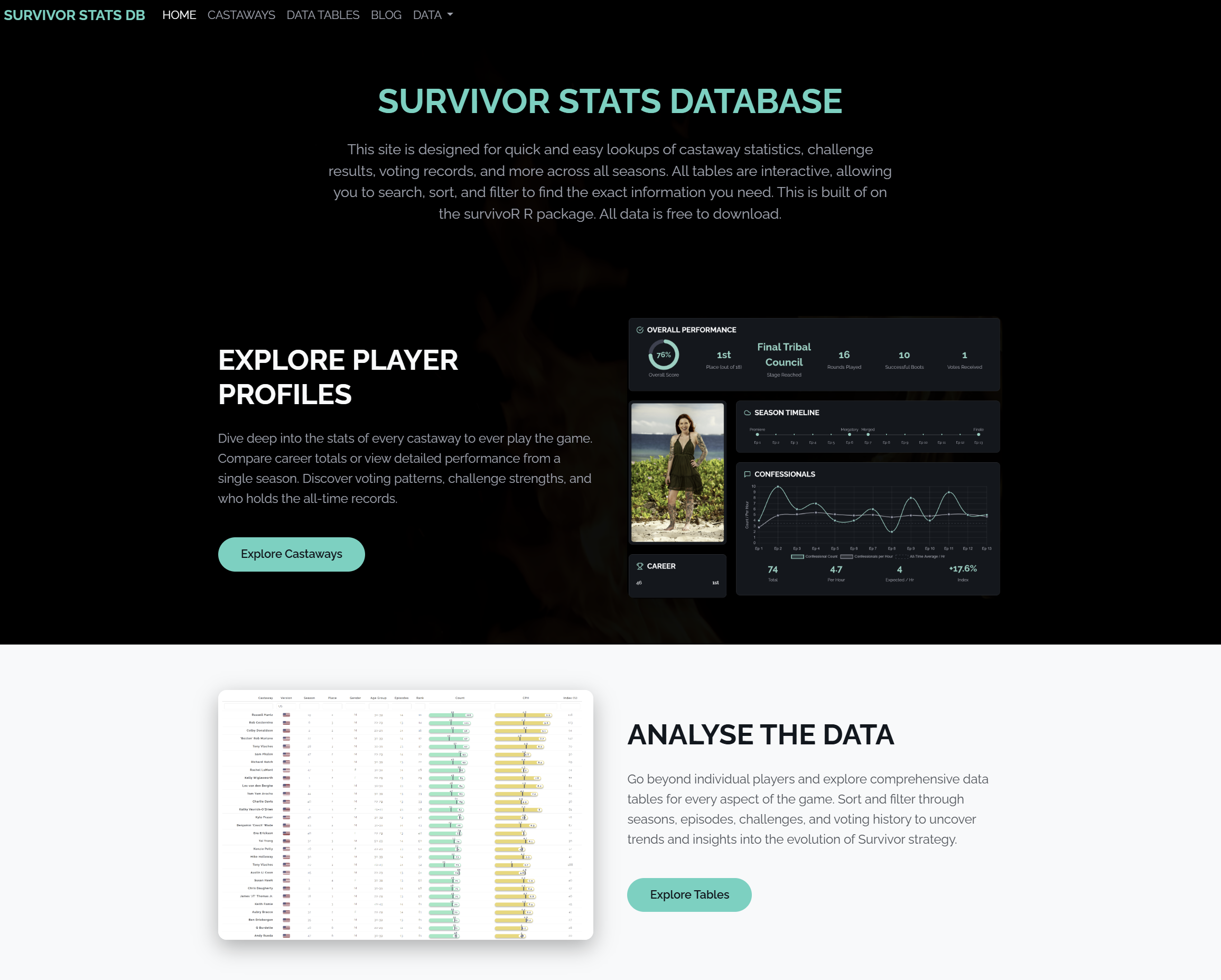 survivorstatsdb is the survivoR package’s companion. It holds interactive tables and charts detailing the castaways, challenges, vote history, confessionals, ratings, and more.