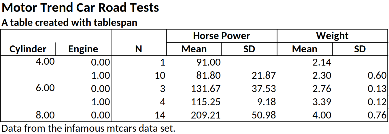 In tablespan, the table headers are defined with a formula. For example, cyl ~ mean_hp + sd_hp defines a table with cyl as the row names and mean_hp and sd_hp as columns: