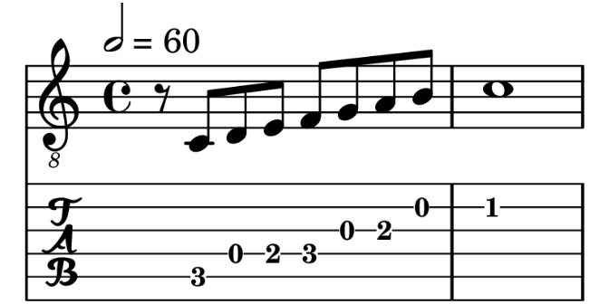 remotes::install_github("leonawicz/tabr")as_music("r8 c d e f g a b c'1") |> plot_music_guitar()