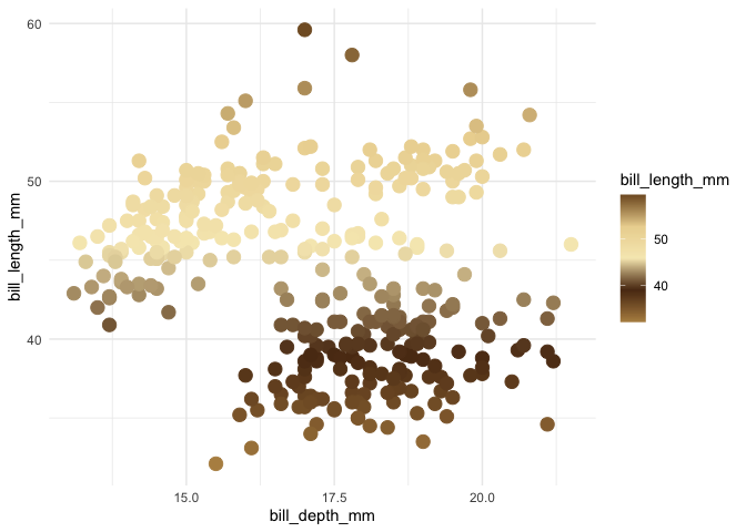 ggplot(penguins , aes(bill_depth_mm, bill_length_mm,color = bill_length_mm)) +