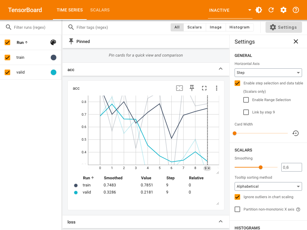 #> Started TensorBoard at http://127.0.0.1:6060TensorBoard will display the results in a dashbboard, similar to one you can see in the screenshot below: