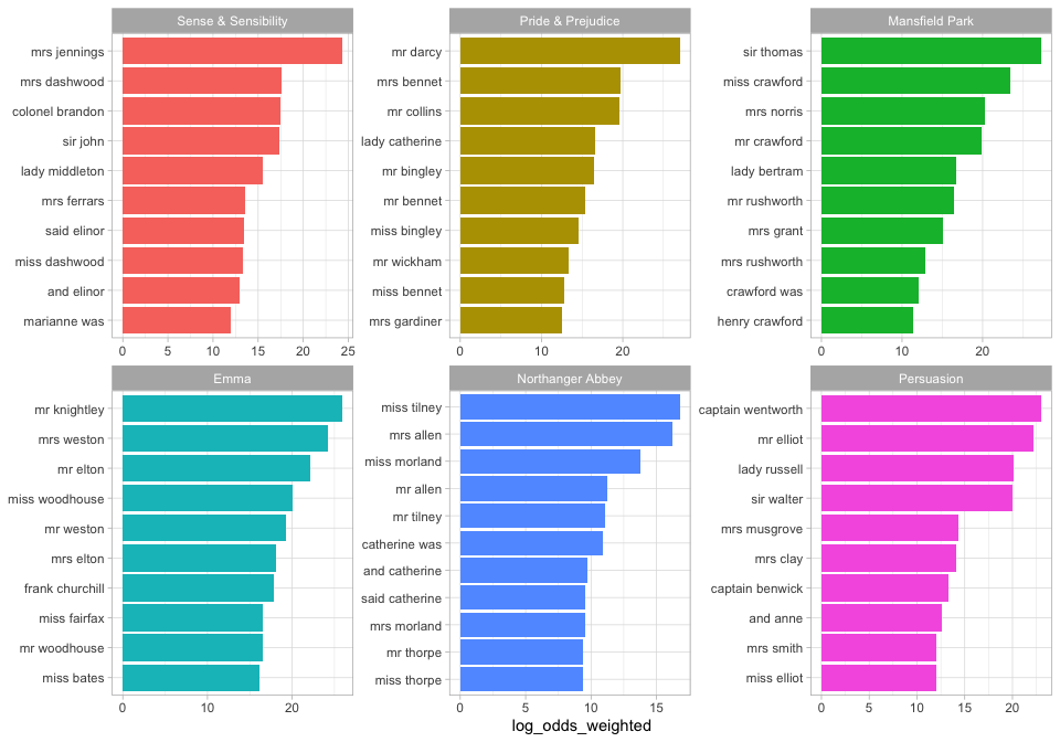 Enter the weighted log odds, which tidylo provides an implementation for, using tidy data principles. In particular, here we use the method outlined in Monroe, Colaresi, and Quinn (2008) to weight the log odds ratio by a prior. By default, the prior is estimated from the data itself, an empirical Bayes approach, but an uninformative prior is also available.