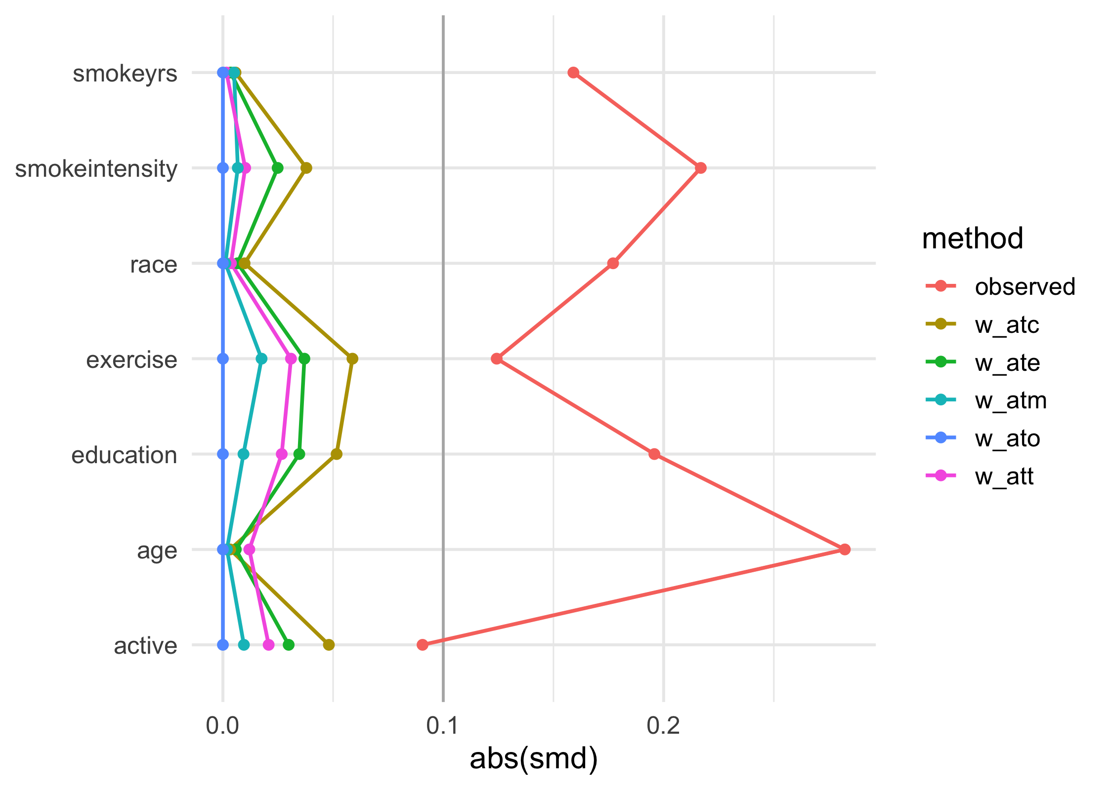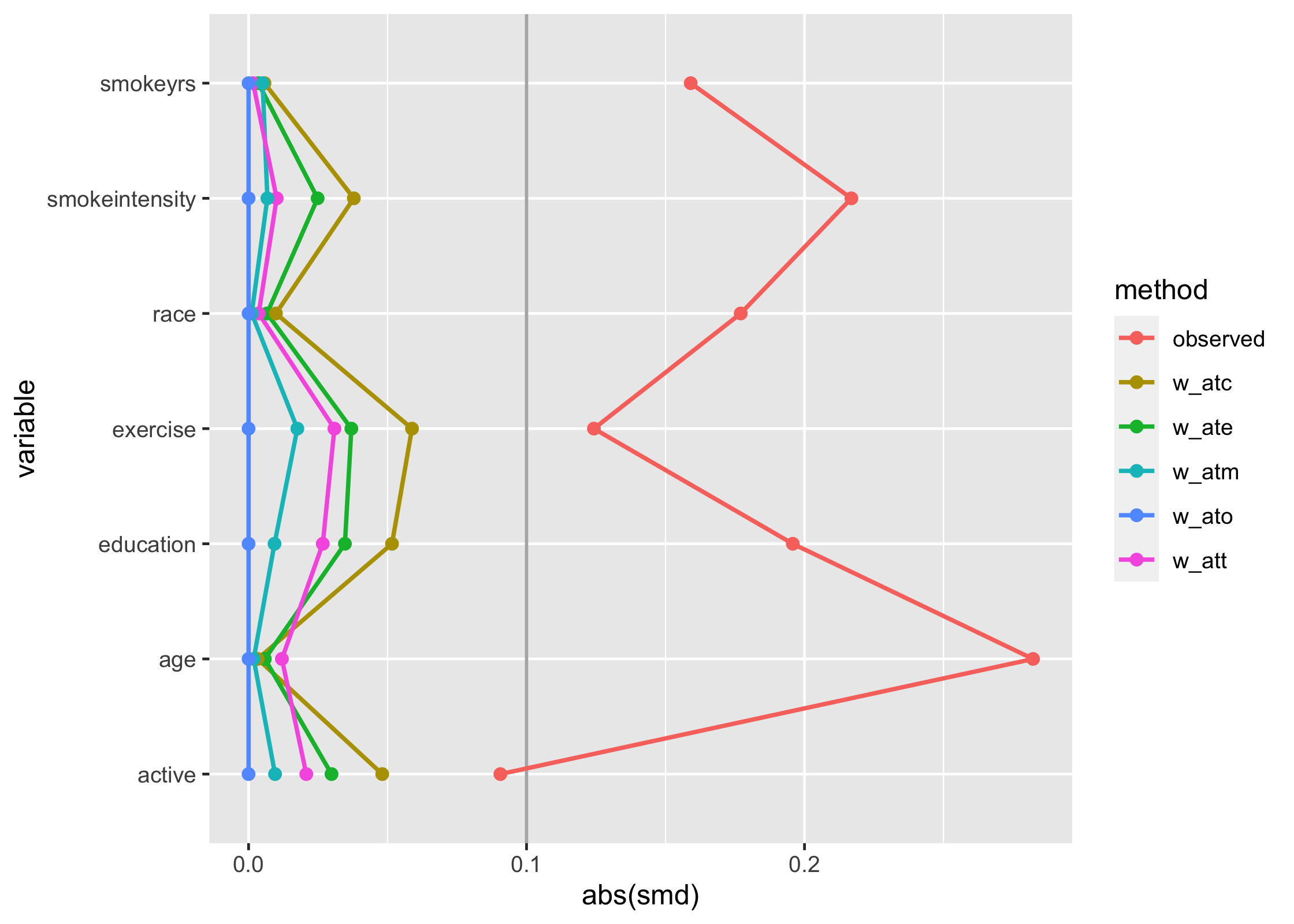 devtools::install_github("malcolmbarrett/tidysmd")tidy_smd() supports both unweighted SMDs and weighted