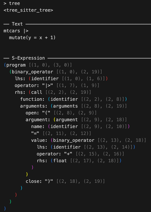 pak::pak("DavisVaughan/r-tree-sitter")With treesitter, you can parse a string containing code for any language that you have a grammar for. Here’s an example with R code: