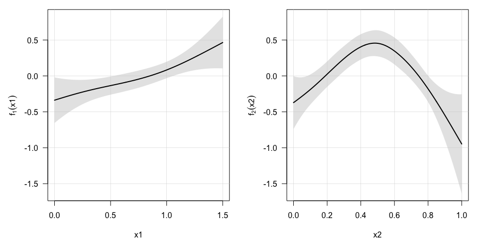 plot(model, select=c(3,4), pages=1) ## Last 2 additive terms in the model