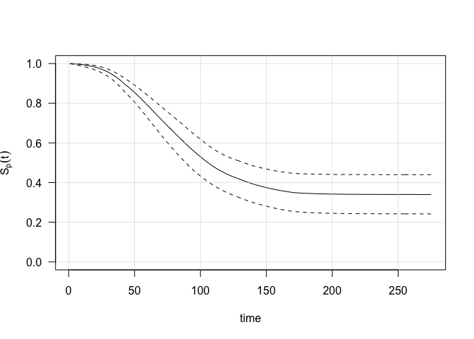 print(tail(obj$Sp,n=1)) ## Cure probability## est low up