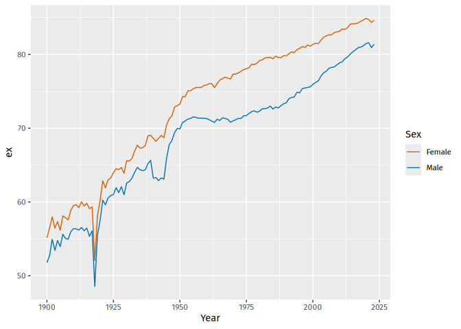#>     Year   Age Sex        mx      qx    lx      dx    Lx    Tx    ex    rx    nx