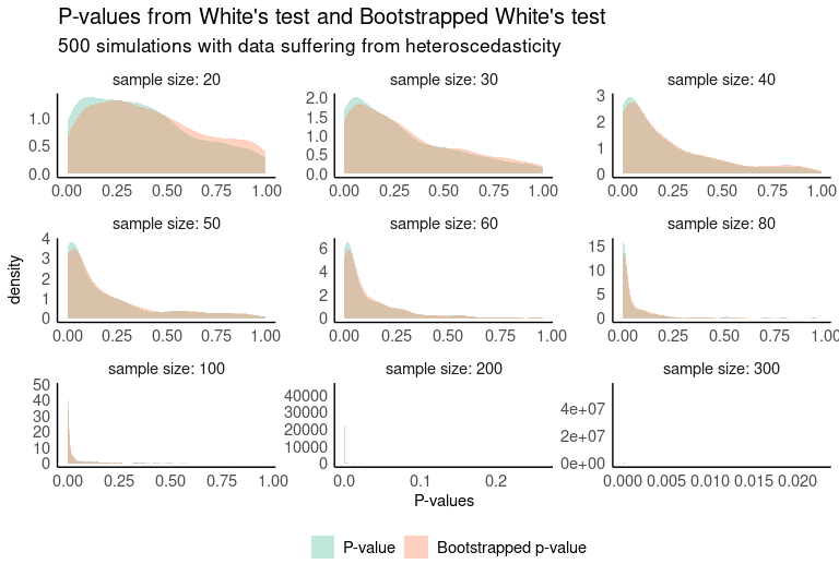 One way to compare the results of both tests is through simulations. The following plot shows the distribution of 500 simulations where the p-value of both tests is computed. The data used for this purpose were artificially generated to be heterocedastic, so low p-values are desirable.