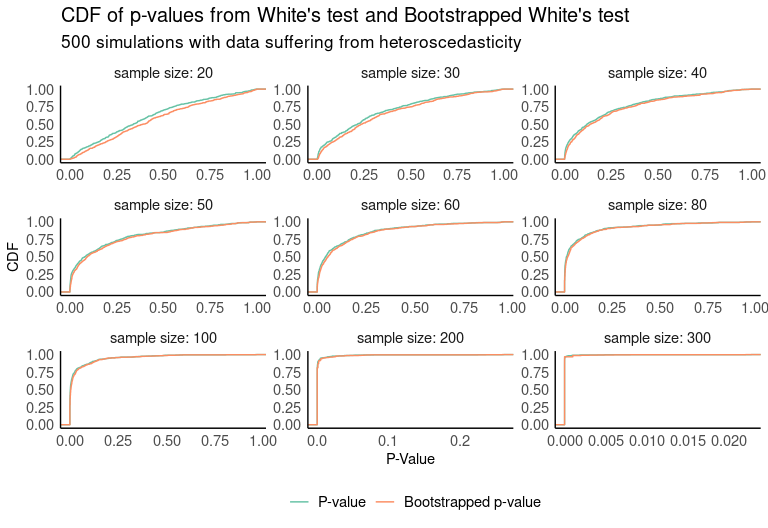 If we look at the cumulative distribution functions of both p-value distributions, we see that in small samples the bootstrapped test returns smaller p-values with higher probability.