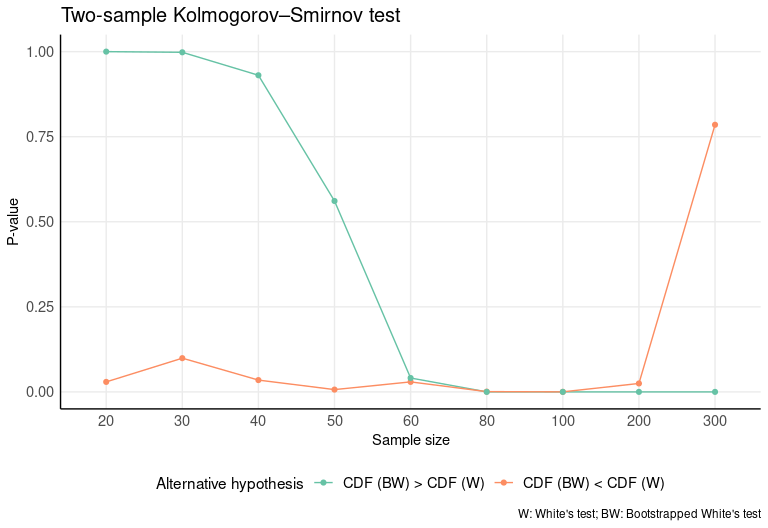 In order to check for differences between the two distributions, a two-sample Kolmogorov–Smirnov test is run. In this case, we’ll test whether one distribution stochastically dominates another, so the test will be run for both alternative sides (CDF (BW) > CDF (W) and CDF (BW) < CDF (W)). We see from the results that CDF (BW) statistically outperforms CDF (W) for samples < 60. No differences are appreciated with samples greater than or equal to 60.