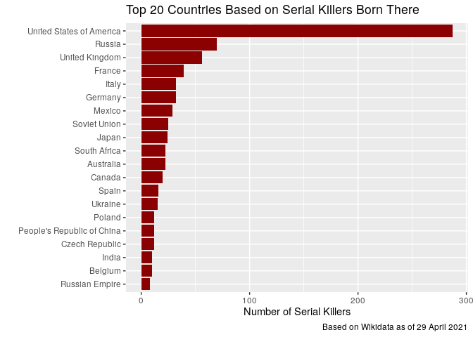 Or, a more dark topic, the top twenty countries by number of serial killers born there: