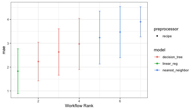 Sometimes it is a good idea to try different types of models and preprocessing methods on a specific data set. The tidymodels framework provides tools for this purpose: recipes for preprocessing/feature engineering and parsnip model specifications. The workflowsets package has functions for creating and evaluating combinations of these modeling elements.