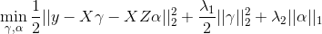 but allows regularization of both the predictors and the external features, where beta is the vector of coefficients describing the association of each predictor with the outcome and alpha is the vector of coefficients describing the association of each external feature with the predictor coefficients, beta. As an example, assume that the outcome is continuous and that we want to apply a ridge penalty to the predictors and lasso penalty to the external features. We minimize the following objective function (ignoring intercept terms):