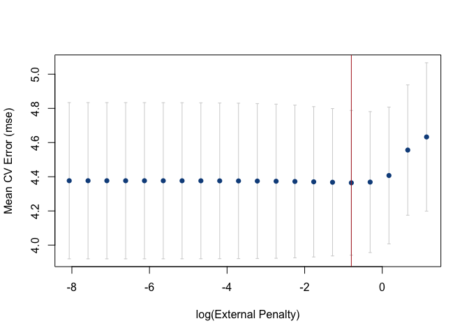 Cross-validation error curves can also be generated with plot by fixing the value of either the penalty on x or the external penalty on external. By default, either penalty defaults the optimal penalty on x or external.